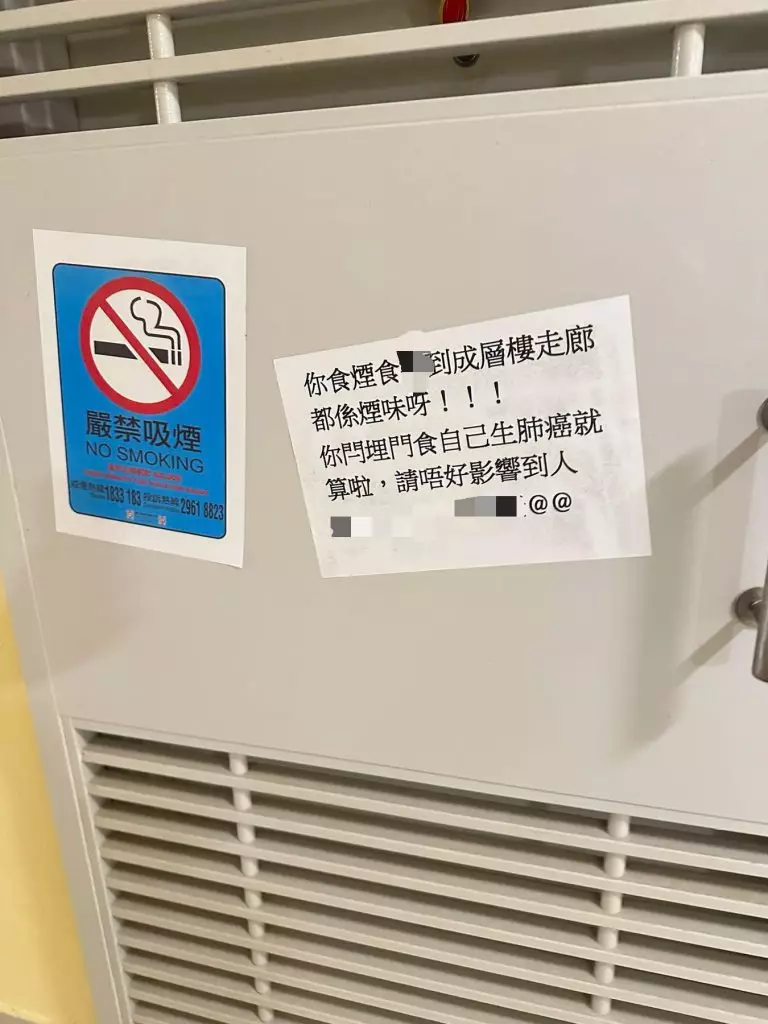 近日網上流傳一張照片,顯示大埔富蝶邨有公屋住戶因在單位內吸煙,導致煙味散播至走廊,引起鄰居不滿。對方在其單位鐵閘上貼上批評字句及「嚴禁吸煙」告示,引發廣泛討論。