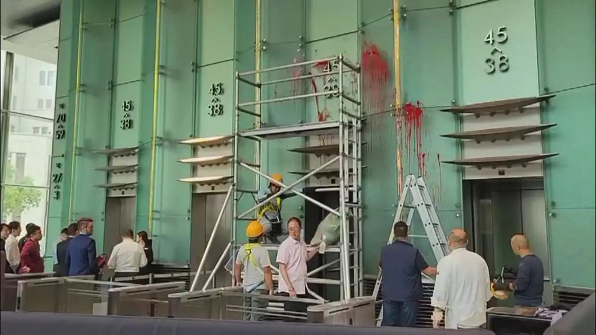 一名49歲內地男子在中環長江集團中心淋紅油,涉嫌刑事毀壞及普通襲擊被拘捕。長江集團回應,事件已交由警方處理。