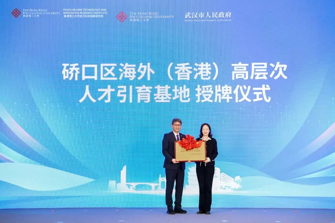 活動現場,硚口區海外(香港)高層次人才引育基地授牌成立,港理大武漢科技創新創業投資基金揭牌成立。