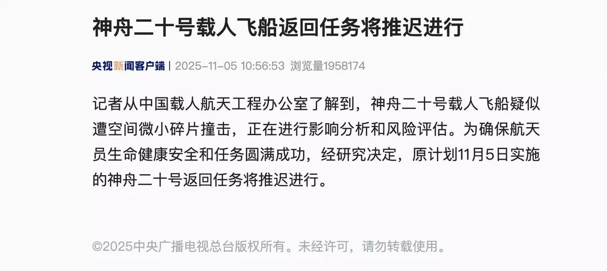 神舟二十號返回任務將推遲進行。央視新聞截圖