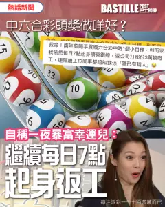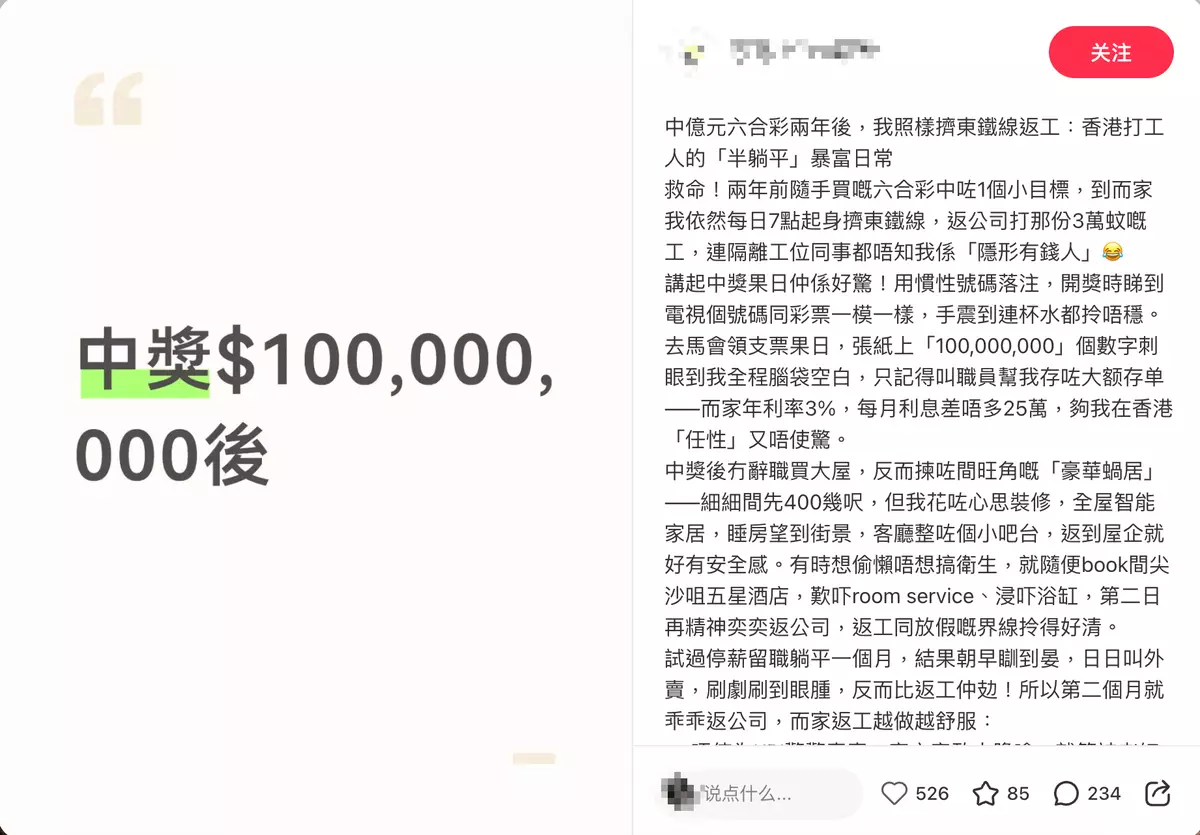 不過令人意外的是,事主指自己中獎後的生活並非如大家預期出現巨大轉變,他選擇維持原有工作節奏:「每日7點起身擠東鐵線,返公司打那份3萬蚊嘅工,連隔籬嗰位同事都唔知我係『隱形有錢人』」。