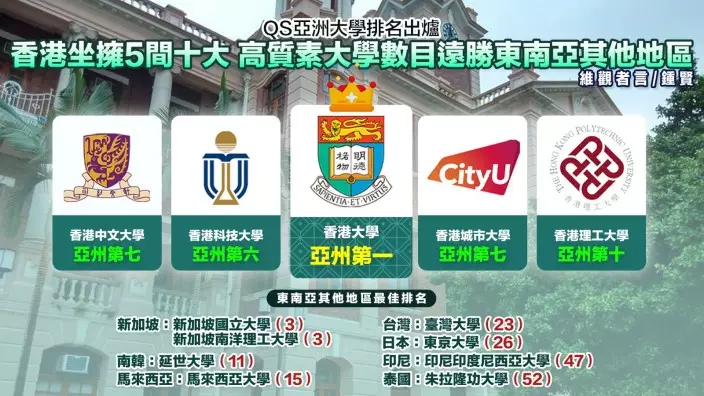 若將比較範圍擴展至其他東南亞地區最佳成績,香港實力更為突出:南韓延世大學第11位、馬來西亞馬來亞大學第15位、台灣大學第23位、日本東京大學第26位、印尼印度尼西亞大學第47位及泰國朱拉隆功大學第52位,排名均遠遜於香港多間大學,反映香港在亞洲教育界的頂尖地位難以取代。