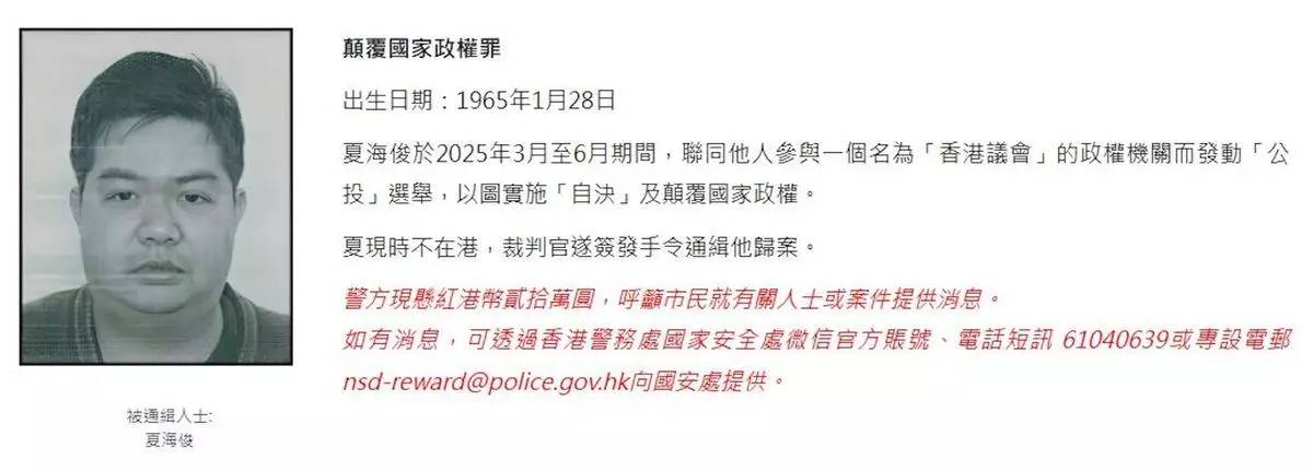 夏海俊於2025年3月至6月期間,聯同他人參與一個名為「香港議會」的政權機關而發動「公投」選舉,以圖實施「自決」及顛覆國家政權。夏海俊現時不在港,裁判官遂簽發手令通緝他歸案。