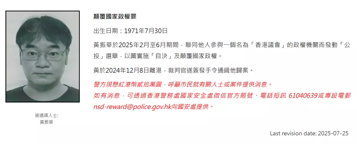 政府早前刊憲,就16名指明潛逃境外人士實施相關措施,包括撤銷特區護照、禁止任何人向他們提供或處理資金等,其中一名被指明的潛逃者為黃振華。