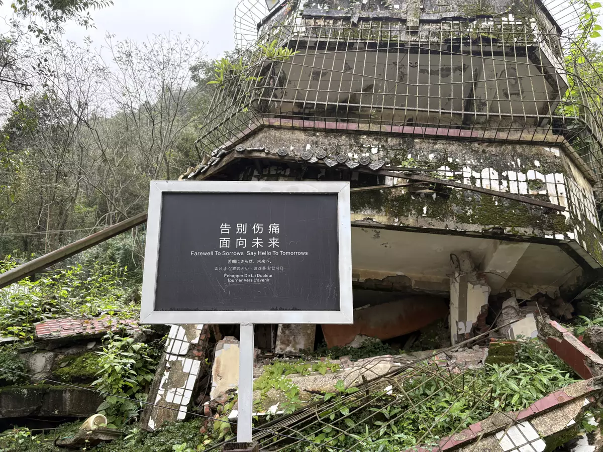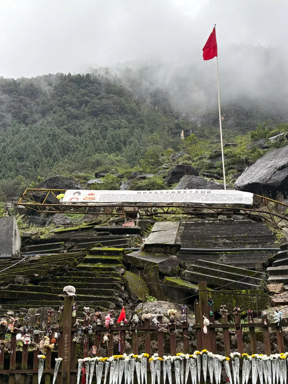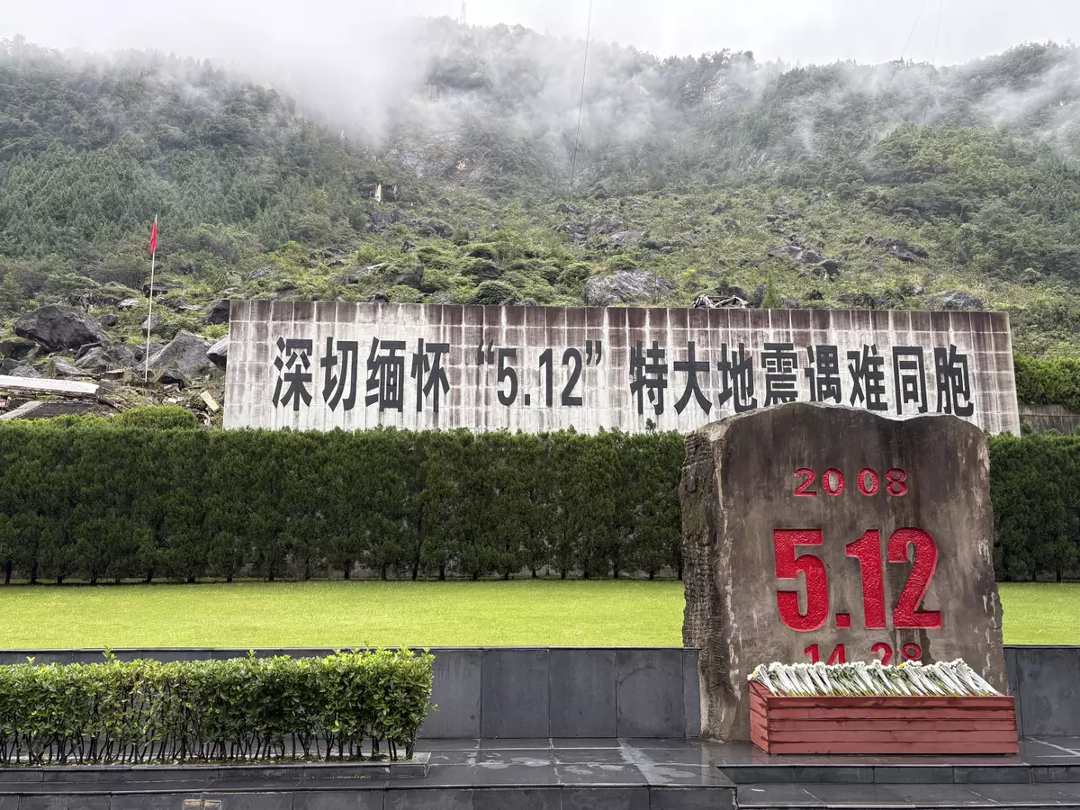 在「深切懷念『5·12』特大地震遇難同胞」紀念碑前,鮮花環繞,《思念曲》低迴地播放著,在背後的山上,佈滿了黑色的巨石。講解員說,地震發生時,這些巨石從山上滾落下來,將北川中學初中部校舍全部摧毀,唯一沒倒的,只有佇立在山腳的五星紅旗,而上千名師生再也走不出茫茫羌山,只能長眠於廢墟之下。