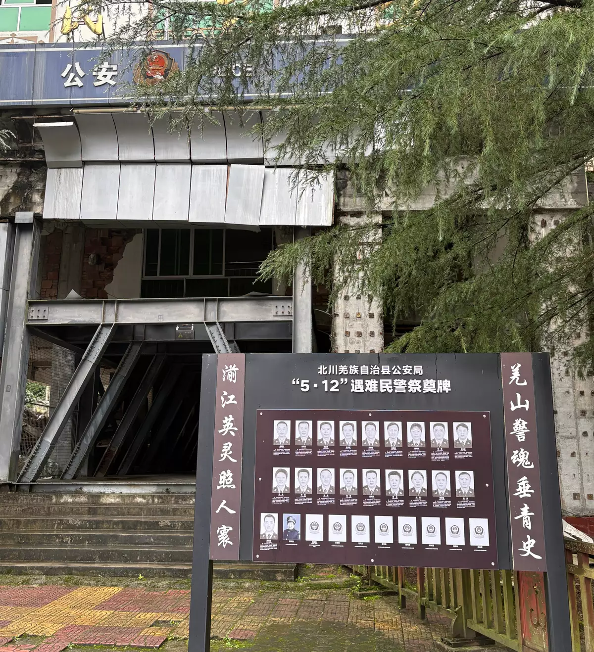 老北川公安局的門口,樹立著一塊「『5·12』遇難民警祭奠牌」,上面列著遇難的28位民警,有一些民警甚至來不及留下一張照片就離開人世。講解員告訴訪問團,有一位叫做「左宜」的民警,地震來臨時他準備往外跑時,想起關押室裡還有兩名犯人,便折返拿上鑰匙將兩名犯人放了出來,自己卻再也沒能走出來。在地震時被放出來的還有在監獄的16名犯人,他們積極投身救災,並向媒體講述民警的事跡。