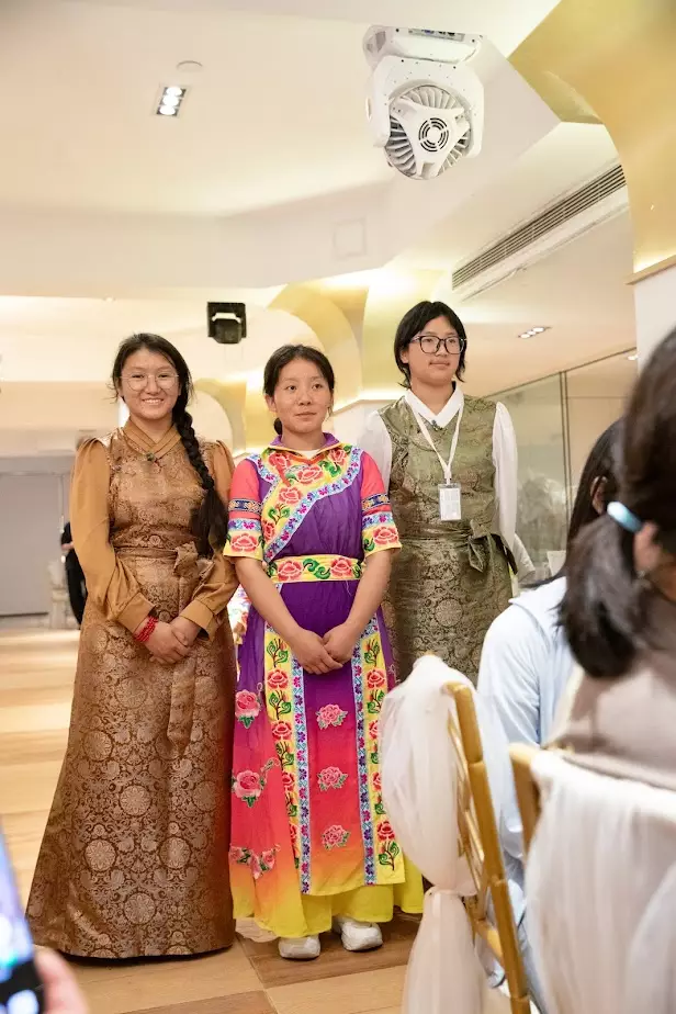 北川中學來港學習交流的藏族(左,右)和羌族(中)學生,穿上民族服裝出席北川基金的歡迎晚宴。楊向杰供相