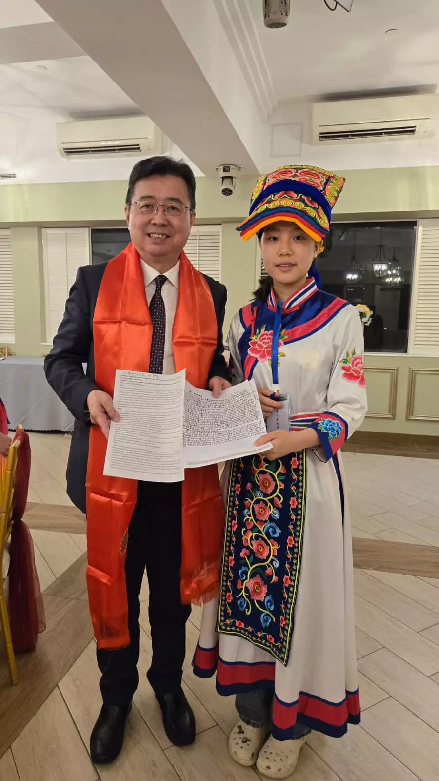 歡迎宴主禮嘉賓全囯政協委員,嶺南大學副校長劉智鵬教授(左)把已評改的英文作業頒回訪港的羌族學生。(2024)楊向杰供相