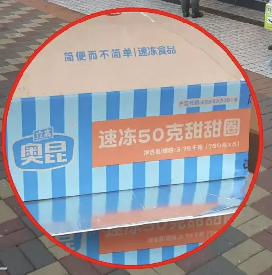 有網民在Facebook發文並上傳照片,指何文田一間烘焙店門外堆放數個「奧昆」品牌急凍冬甩紙箱,箱上標明「速凍甜甜圈50克,$228/75個」。