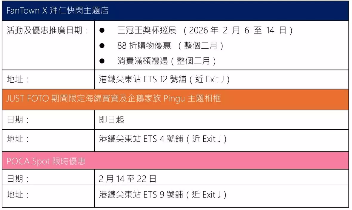 踏入新春佳節,MTR Shops誠意呈獻二月限定「港鐵車站商店粉絲狂歡‧福利月」,為一眾粉絲送上滿滿驚喜!整個2月期間,三大人氣主題店將同步帶來節日限定亮點 —— 足球迷熱捧的全球知名球會品牌專門店FanTown,展出為期兩週的 「三冠王獎杯巡展」;人生四格自拍館 JUST FOTO攜手人氣萌趣 IP 海綿寶寶及企鵝家族 Pingu,推出全港獨家新年及情人節限定相框;而韓迷最愛的偶像小卡專門店 POCA Spot 亦同步推出限時優惠。無論你是熱血球迷、打卡控,還是追星族,都能在港鐵車站商店找到專屬驚喜,輕鬆收集節日快樂與儀式感。