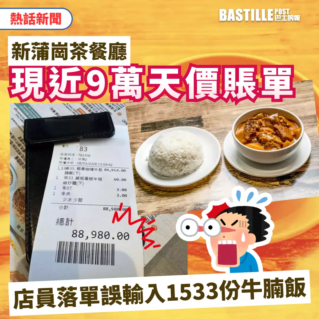 近日一張高達逾8萬蚊的天價下午茶賬單掀網絡熱議。有食客分享在新蒲崗一間茶餐廳用膳後,收到一張近九萬元的驚人賬單,經查詢後發現,原來是店員落單時輸入錯誤所致。