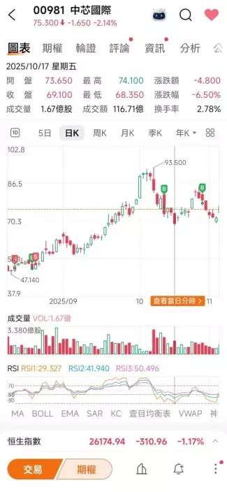 但睇睇部份股在這個跌浪中的表現,就睇到那些是弱股,那些是強股。中芯近日低位是10月17日特朗普聲稱會再打關稅戰時,跌到最低68.35元,到本周三再試低位是69.35元,第二波尋底跌不穿第一波低位,走勢較強。
