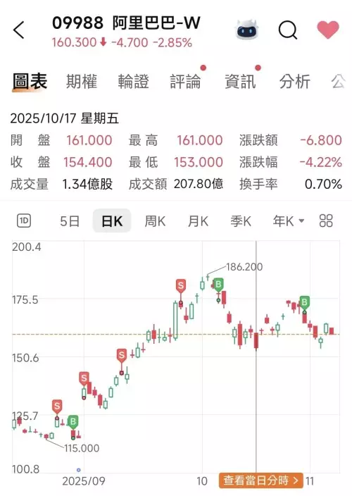 阿里巴巴近日低位是10月17日的153元,本周三低位154.2元,同樣跌不穿10月中低位。