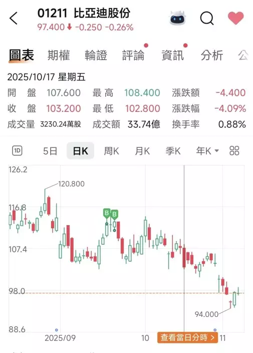 比亞迪也差不多,10月17日低見102.8元,反彈後不斷跌,周三低見94元,同樣是軟腳蟹。現在市場甚不看好車股,認為價格競爭太厲害,即使他們是中國領先車企,亦不斷俾人沽。