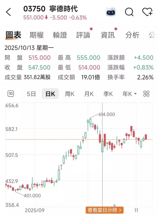 寧德時代近日低位是10月13日的514元,本周三低見525.5元,離低位更遠,可見寧德時代走勢更強。