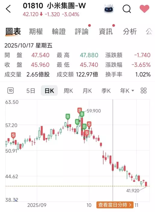 小米和比亞迪雖然同樣被高盛睇好,但近期是弱股,小米10月17日的低位是45.74元,之後順流而下再創低位,周三低見42.16元,周五上午連這個位也插穿,走勢甚弱。