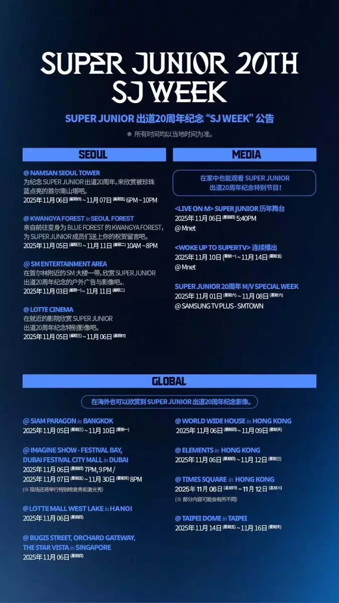 為慶祝20週年,SM娛樂自11月3日起展開為期一周的「SJ WEEK」,與全球粉絲同步狂歡!包括首爾南山塔外牆、聖水洞SM總部的LED媒體牆、杜拜Imagine Show、曼谷Siam Paragon、新加坡Bugis Street等多個海內外地標,都會出現Super Junior專屬內容,而在香港的銅鑼灣時代廣場、中環環球大廈,以及九龍站圓方ELEMENTS的大型屏幕,亦會在11月6日至12日播放SJ出道20周年紀念影片。