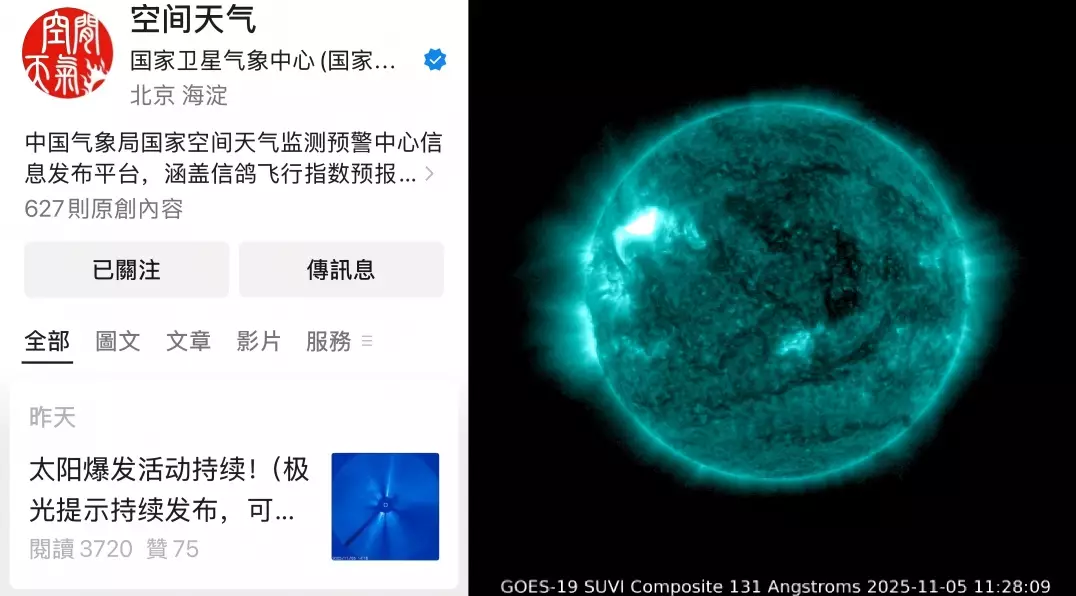 目前太陽活動正處於中高水平,近一兩日或持續出現M級以上耀斑,並可能引發中至大型地磁風暴。圖片來源:國家衛星氣象中心微信公衆號