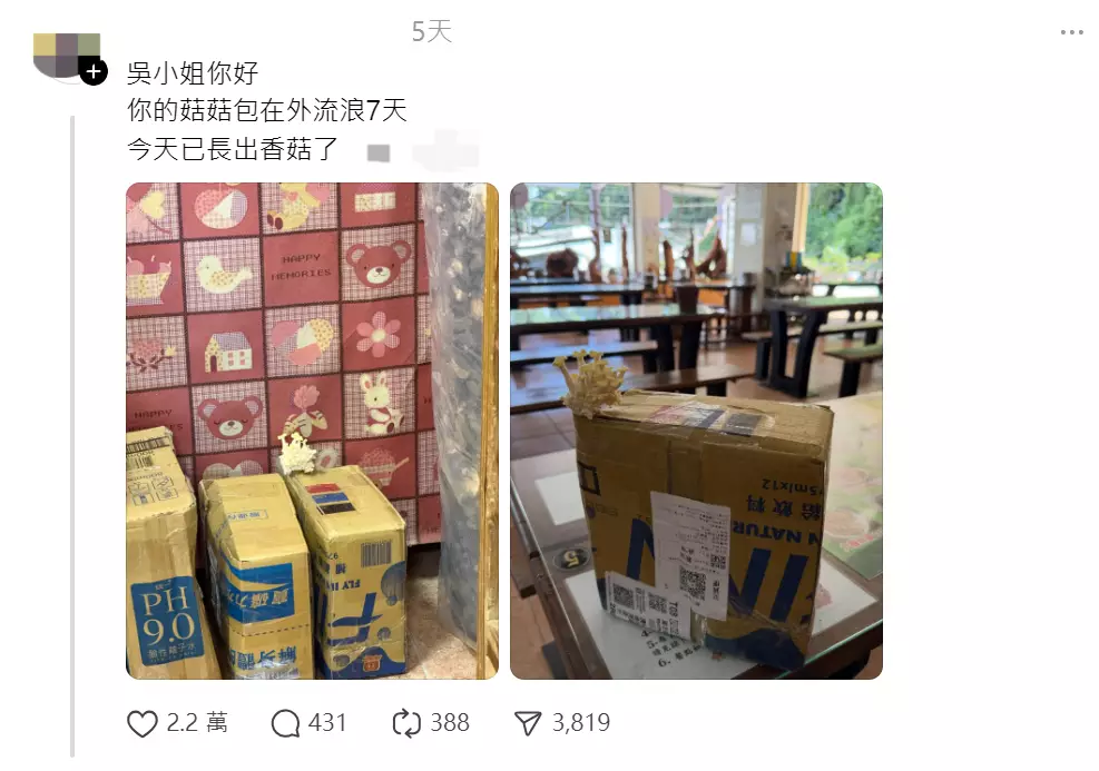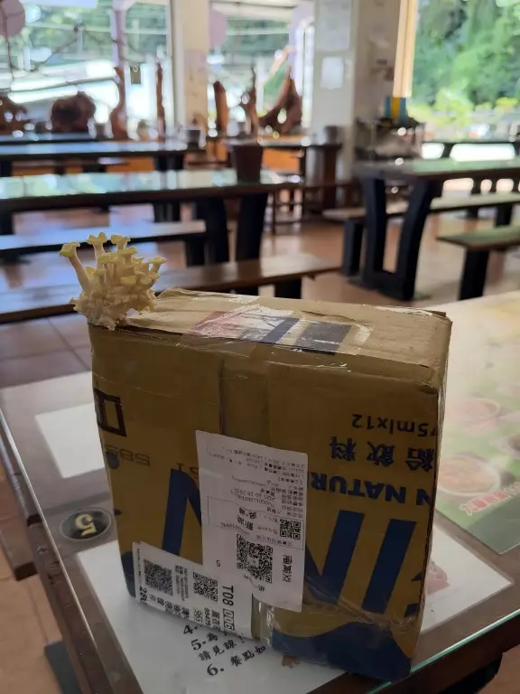 台中一個被退回的包裹,經過七日運送延誤後竟在紙箱縫隙間長出整叢香菇,畫面似「會呼吸的快遞箱」。相片上載到社交平台後,立即引起熱議。