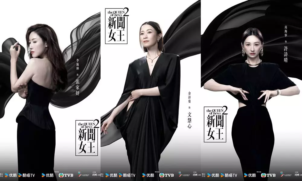 而在「Fashion」系列中,五大女主角佘詩曼(阿佘)、李施嬅、高海寧(高Ling)、王敏奕、陳曉華齊齊穿上黑色時尚高訂服爭妍鬥麗,阿佘一貫單靠眼神+氣勢食糊,高Ling露腰力抗李施嬅大露背,至於小花王敏奕及陳曉華,則大晒完美線條,各有各靚。而海報的強烈「黑白對比」設計概念亦另有寓意,原來白色背景代表傳統媒體,黑色飄揚的黑紗代表網絡媒體洪流,象徵著一眾在傳統媒體努力成長的女主角、正面對著網絡媒體洪流的衝擊,含蓄地呼應了《新聞女王²》全劇的最大衝突位。