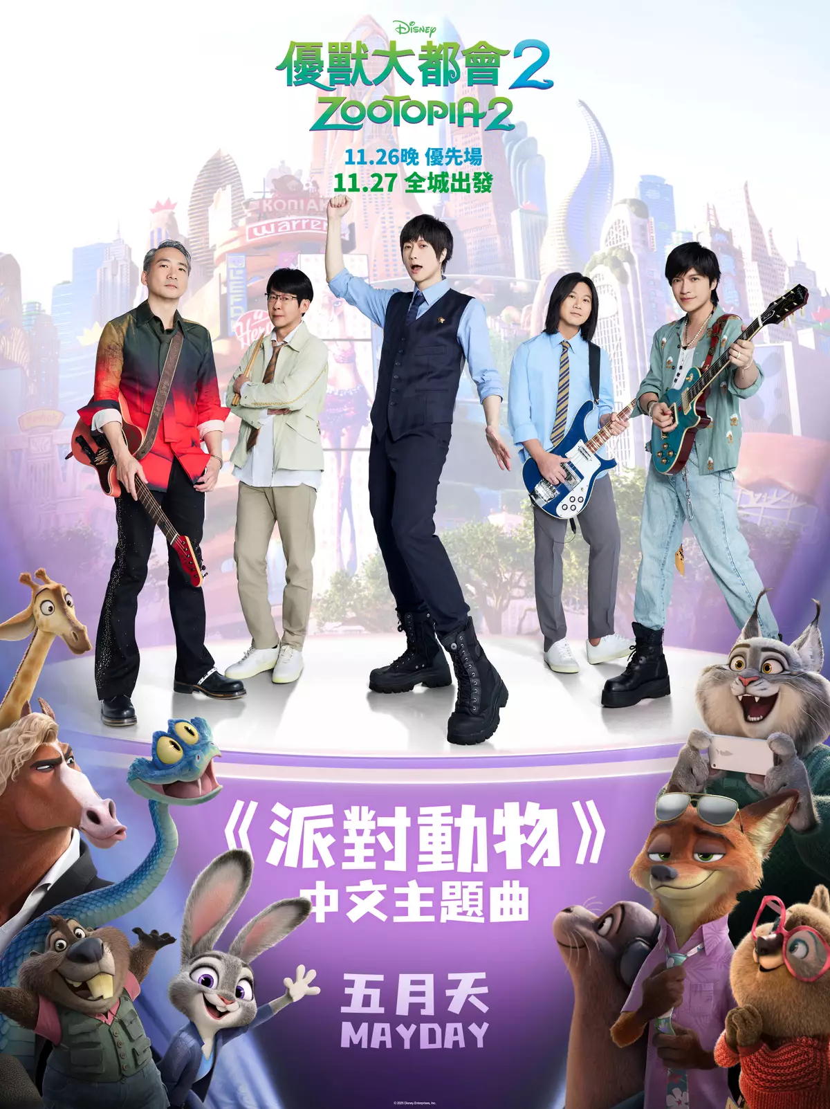 由華語搖滾天團五月天(Mayday)創作並演唱的經典歌曲《派對動物》將作為迪士尼超人氣動畫鉅製《優獸大都會2》中文主題曲,11月底隨電影登陸大銀幕,帶領觀眾重返優獸大都會,展開玩得更大去得更盡的冒險。
