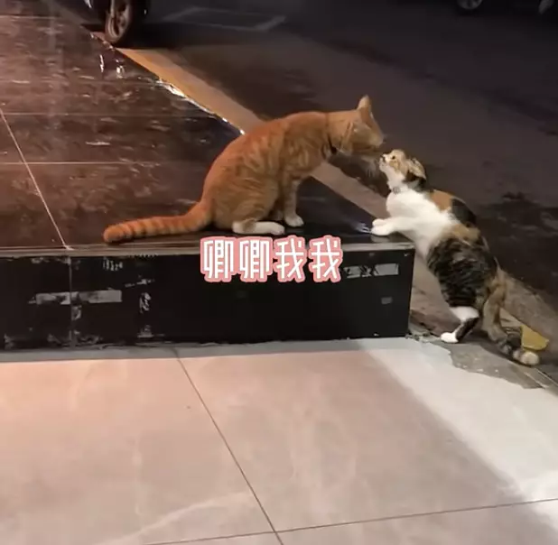 一隻橘貓正在跟一隻三花貓卿卿我我。影片截圖