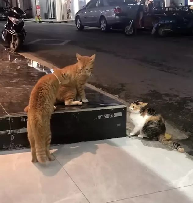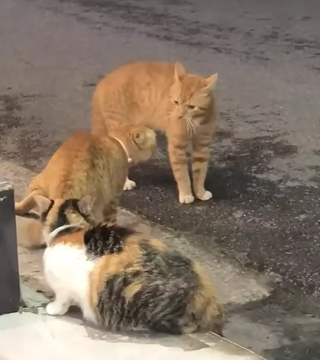 原來是一隻母橘貓,母橘貓看到公橘貓正在跟三花貓調情怒不可遏,衝上去阻止兩隻貓繼續調情,一臉生氣就像是在問「你們倆在幹嘛」。