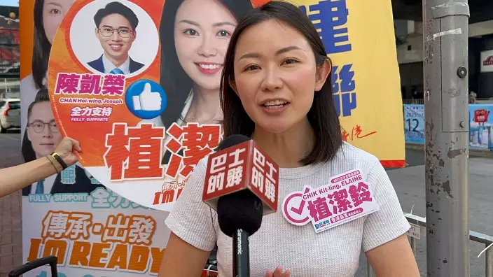 2號的民建聯參選人植潔鈴,穿白T、拿着「大聲公」在梯子上向路過市民為自己拉票,其拉票團隊約10人,身著橙色背心,十分亮眼,同黨東區區議員林永晟到場支持。植潔鈴表示,今次競選十分激烈,作為最年輕的一員,她坦言感到很大壓力,要和「老前輩」一起競爭,但很有信心,希望將年輕和活力的形象帶入立法會。她指,自己本身是東區區議員,亦擔任3屆立法會議員助理,學習不少,亦在社區做了很多工作,累積經驗,故今天想告訴大家,她已經準備好,希望能在立法會的平台繼續為市民服務。