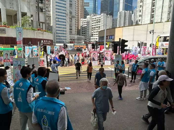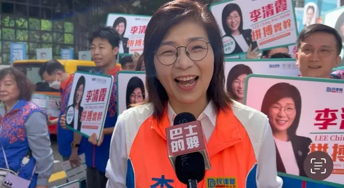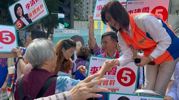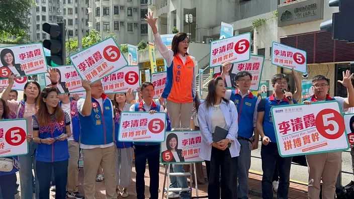 5號李清霞亦是民聯建參選人,為現任東區區議員,其拉票團隊著深藍色背心。李清霞到場後喊口號「拼搏實幹」,提振團隊精神,黨友王志鐘助她造勢。李清霞說,選舉氛圍熱鬧,大家一起努力,坦言能出來參選一定有信心,其優勢在於服務地區時間長達22年,2019年黑暴期間是民建聯唯一當選的區議員,市民覺得她實幹,地區經驗豐富。她指,灣仔和東區舊樓較多,僅灣仔區的「三無」大廈就有約400棟,東區有80多棟,故她希望將來進入立法會,在政策層面推動舊樓管理。