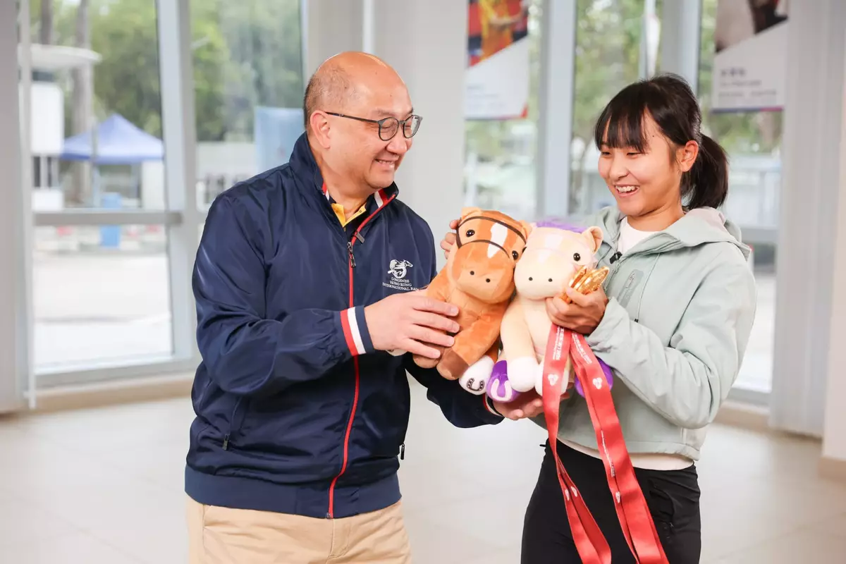 李思穎帶上三面獎牌接受《駿步人生》專訪,馬會公司事務執行總監譚志源代表馬會向她送上一對馬兒毛公仔。