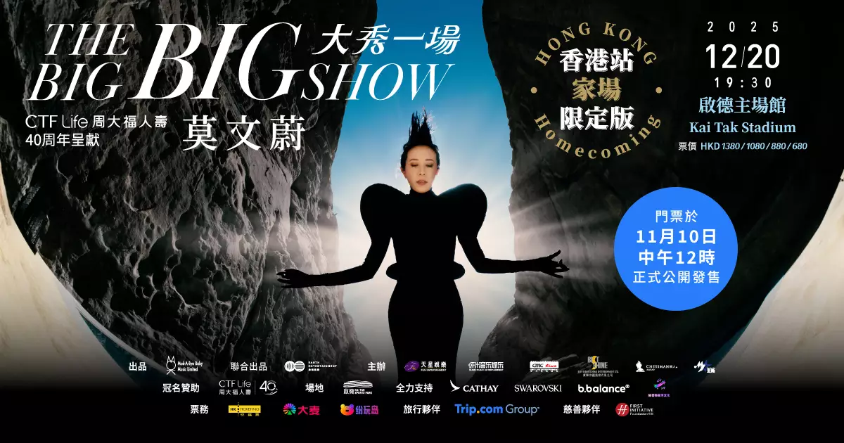 《CTF Life 周大福人壽40周年呈獻:莫文蔚 THE BIG BIG SHOW 大秀一場 香港站「家場」限定版》將於12月20日在啟德主場館隆重舉行,莫文蔚Karen作為首位華人流行女歌手在北京國家體育場(鳥巢)舉行演唱會,自幼便在九龍城長大的她透過這次和「家人」久別重逢的喜悅,把「家」的溫暖帶到啟德主場館和大家一起分享。票價分別為$1380、$1080、$880 和 $680共四種,訂於明天(11月10日)中午12時在Hong Kong Ticketing 快達票網站、大麥網及纷玩島公開發售。