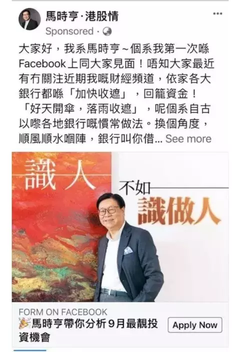 香港多位财經名人被人假冒在fb出廣告,吸引水魚入騙財投資局,馬時亨便是其中之一。這類廣告為何至今仍封之不絕,謎團終於解開。