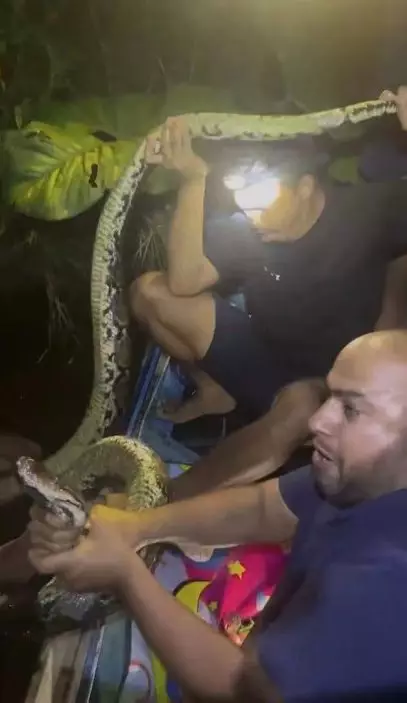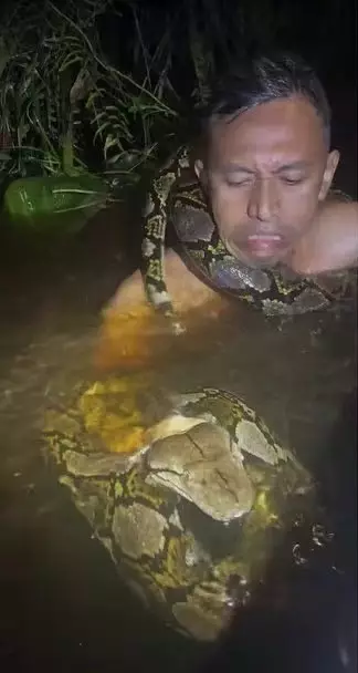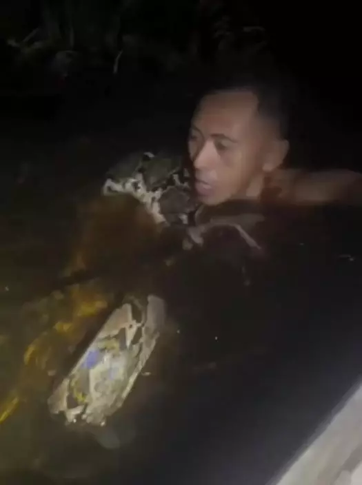 綜合外媒報導,印尼婆羅洲(Borneo)一名男子赫魯(Heru)擁有豐富的捕蛇經驗。日前晚間,他與同伴乘船時發現岸邊河水中出現一條龐大的蟒蛇,於是立即伸手入水,最終成功抓住巨蟒頭部附近。豈料,這條長達6米的巨蟒竟猛烈反擊,憑藉驚人力量將赫魯整個人死死纏住,甚至拖下船帶往水深的地方,直至赫魯整個人被淹沒在水中,情況一度十分危急。