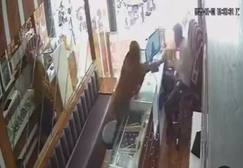 女子潑辣椒粉搶劫失手遭珠寶店店主狂扇20巴掌嚇到倉皇落跑。影片截圖