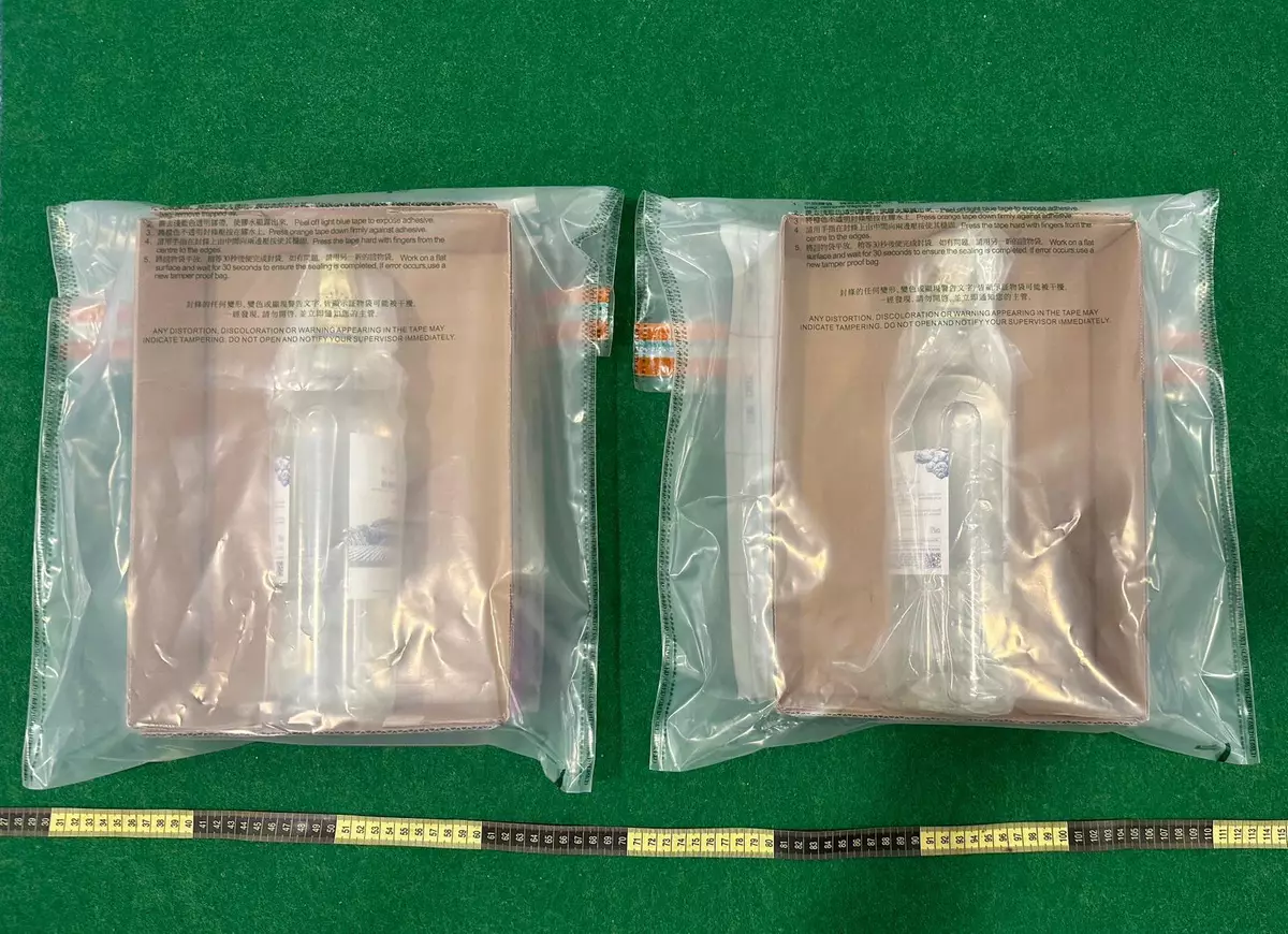一名52歲男旅客準備從本港飛往斐濟楠迪。海關人員截查時,在他的行李中搜出該批偽裝成酒的懷疑液態冰毒,將他拘捕。