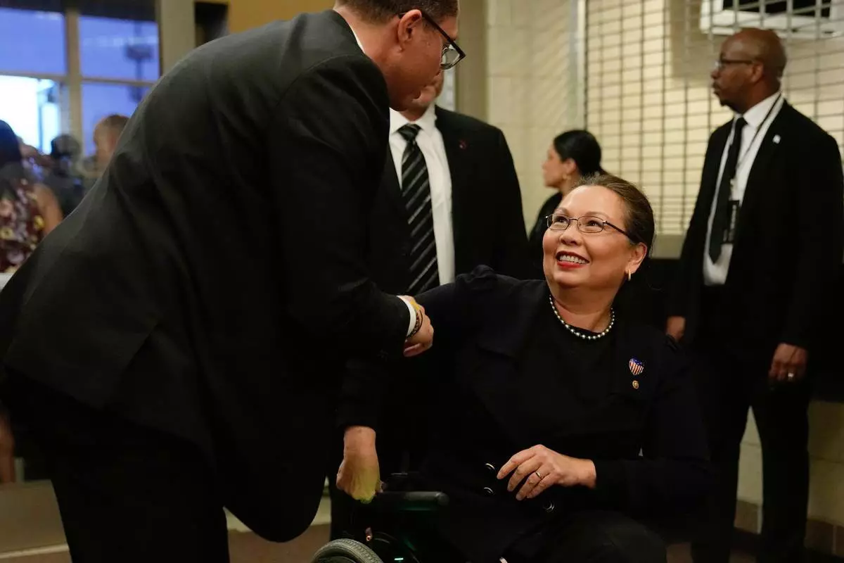 2026年3月6日周五,伊利諾伊州民主黨參議員譚美·達克沃斯(Tammy Duckworth)抵達芝加哥希望之家,出席傑西·積遜牧師(Rev. Jesse Jackson)的公開追思禮拜。(美聯社圖片/Erin Hooley) AP圖片