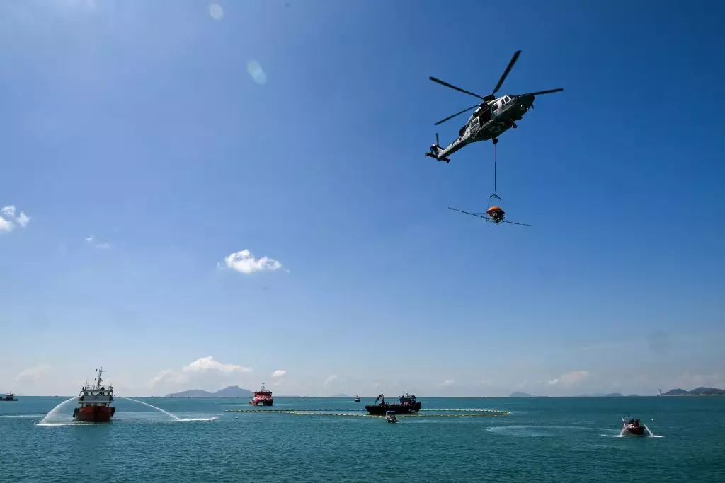 海上溢油及有害有毒物質溢漏演習測試海上污染事故應變能力。政府新聞處圖片