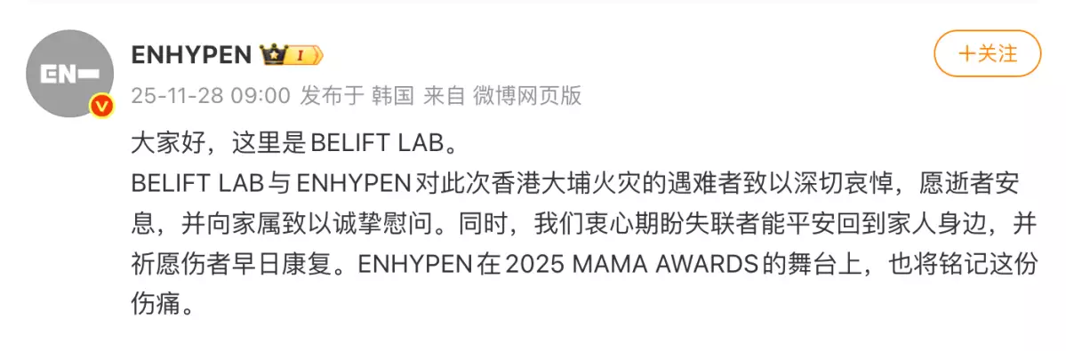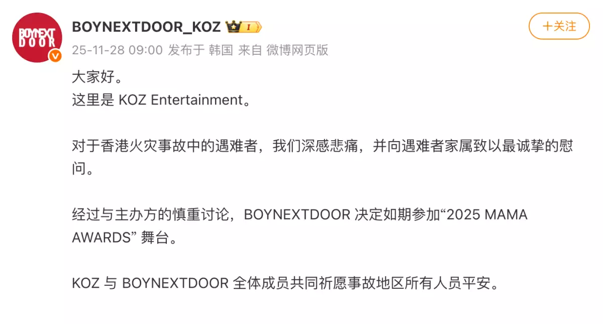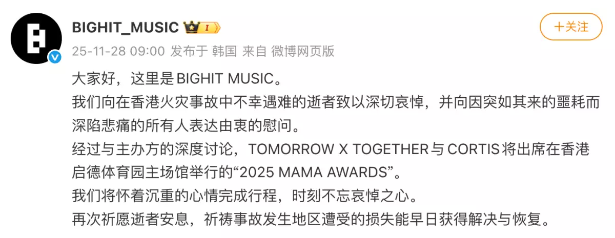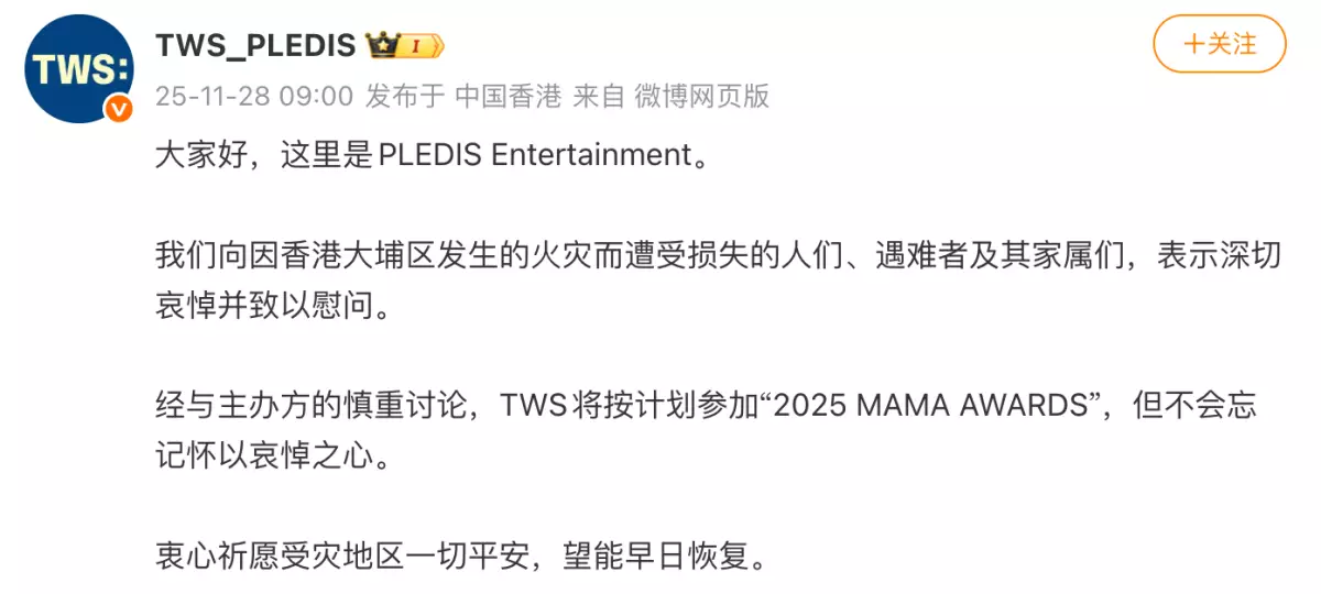 公告中也提到:「經過與主辦單位的深度討論,將出席在香港啟德體育園主場館舉行的2025 MAMA AWARDS。我們將懷著沉重的心情完成行程,時時刻刻不忘哀悼之心。再次祈求逝者安息,祈禱事故發生地區遭受的損失能早日獲得解決與恢復。」