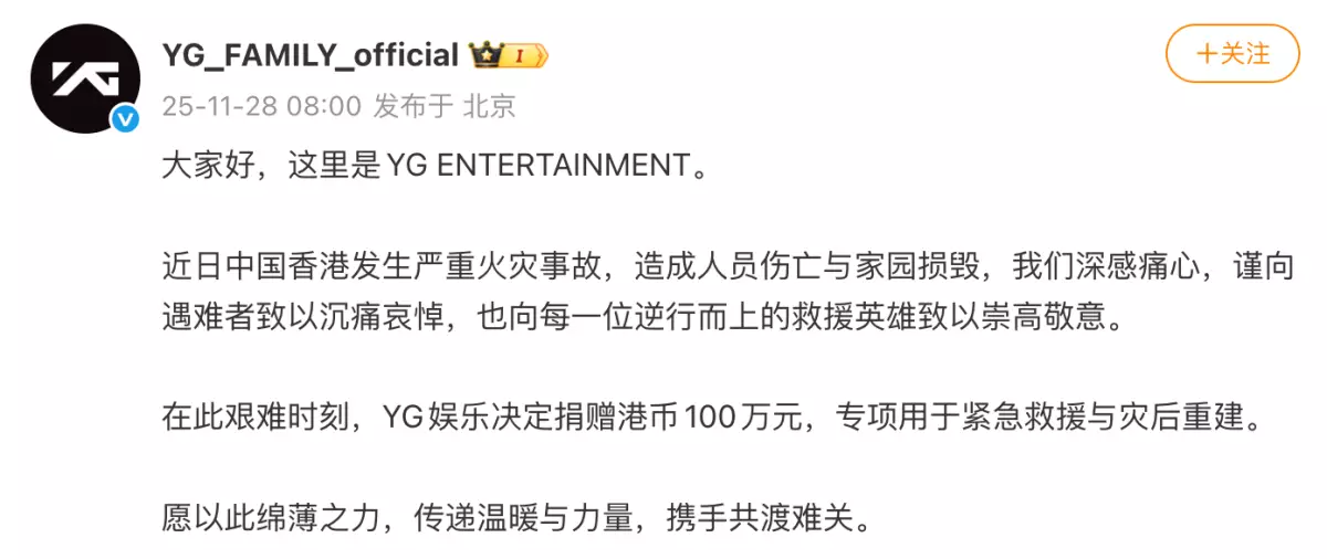 YG娛樂旗下男團TREASURE及女團BABYMONSTER,目前也正身處香港準備參與《2025 MAMA Awards》。11月28日公司透過官方微博發文:「近日中國香港發生嚴重火災事故,造成人員傷亡與家園損毀,我們深感痛心,謹向罹難者致以沉痛哀悼,也向每一位逆行而上的救援英雄致以崇高敬意。在此艱難時刻,YG娛樂決定捐贈港幣100萬元,專為緊急救援與災後重建。願以此綿薄之力,傳遞溫暖與力量,攜手共渡難關。」