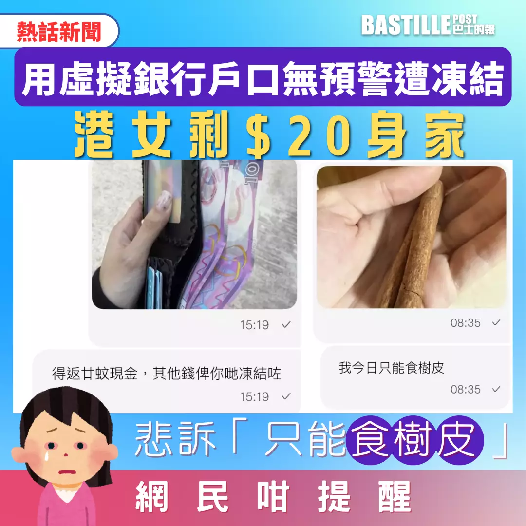 有港女使用虛擬銀行不足兩個月,日前收取一筆5000元款項後,戶口竟無預警遭凍結,導致她僅剩20元現金度日,連日與客服交涉更上演「手持樹皮」「乞食」等戲碼碼,引發網絡熱議。