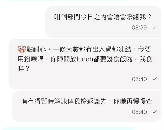 事主在社交平台發文稱,使用本地一虛擬銀行約兩個月,主要用作網購,最大交易僅5000元。未料戶口在無預警下被凍結,她懷疑與三日前一筆5000元自由工作收入有關,但款項存入後她消費約1000元,未見異常。凍結後事主多次聯絡客服,展示銀包僅餘60元、20元現金的照片,哀求「放Lunch都要錢食飯,我食咩?」卻只獲回覆「耐心等待」。