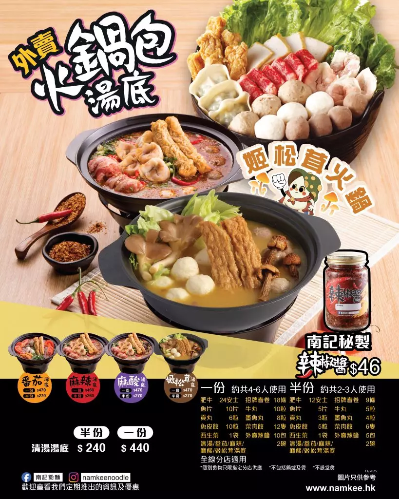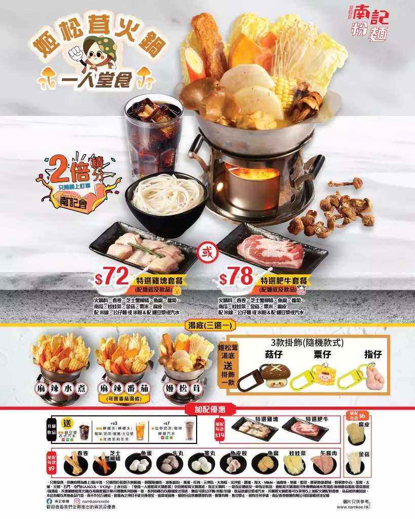 冬天另一令人食指大動的絕對是打邊爐,暖烘烘即趕走寒意!南記粉麵為你準備了姬松茸火鍋,可選特選雞塊或特選肥牛套餐,配料沾上姬松茸香氣與濃郁鮮味,湯底濃而不膩令人食慾大增,一於約齊親朋好友,共享姬松茸滋味!