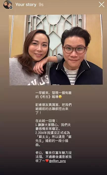 事件鬧大後,老婆Anita(馮翠珊)今日(11日)傍晚首度開腔,親自於IG Story回應。佢貼出一張搭住老公膊頭的甜蜜合照,輕鬆寫道:「一早醒來,發現一個有趣的《考古》報導。記者朋友真厲害,把我們結婚前的古蹟都挖出來了!」