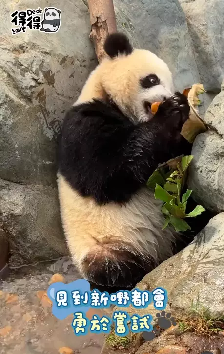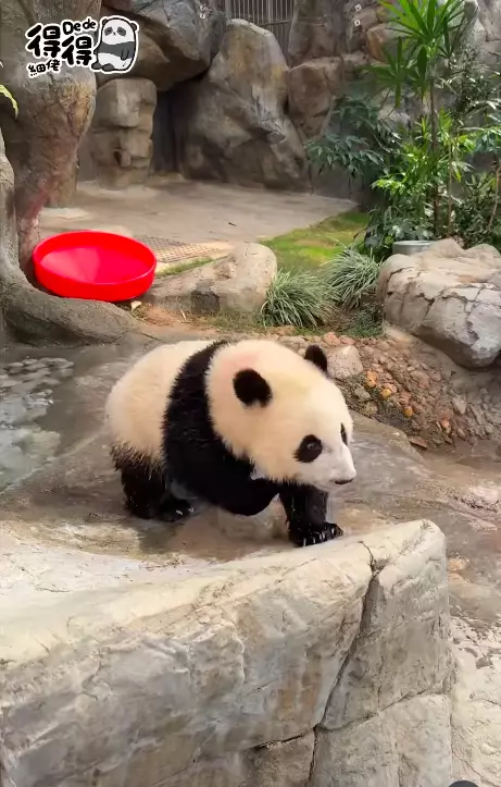 在海洋公園社交平台最新的影片就見到,家姐加加首次邁出第一步,雖然對瀑布小溪有點好奇,但仍然無懼新挑戰,一腳就踏進水裡,而且還爬高爬低來探險。細佬得得見家姐玩得開心,自然就「唔執輸」,又要落水玩埋一份,仲邊玩邊食,成身濕晒變「落湯熊」都唔怕。