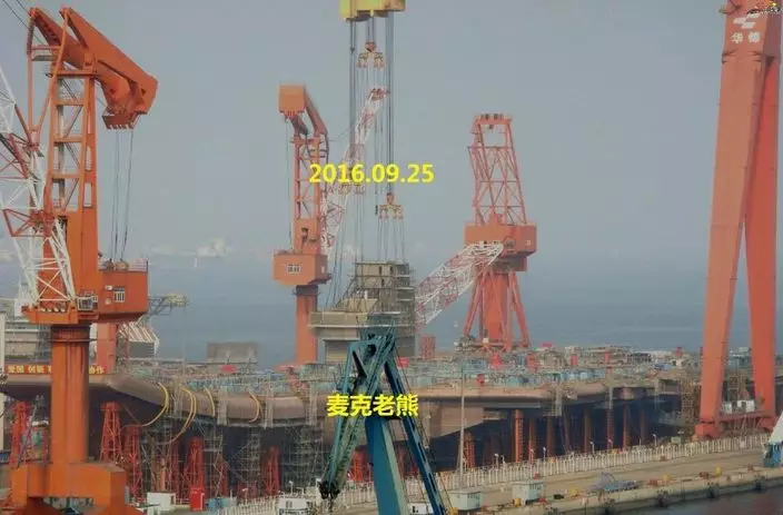 大連造船廠內的首部001A型國產航母,9月被拍到以吊臂把預先裝好的艦島焊接到甲板上,最新的照片見到,短短一個多月,艦島組裝已接近完成。