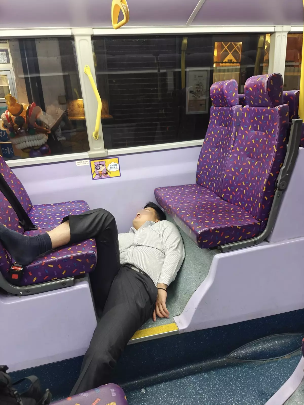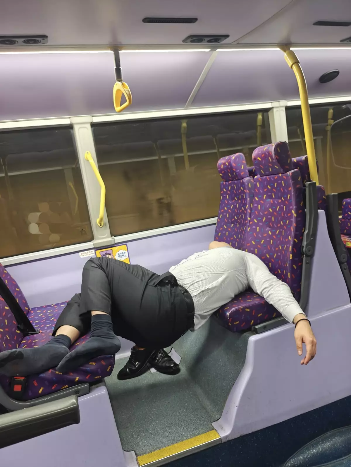 一名男子疑飲醉酒至不省人事,整個人癱睡在座椅間至總站。FB圖片