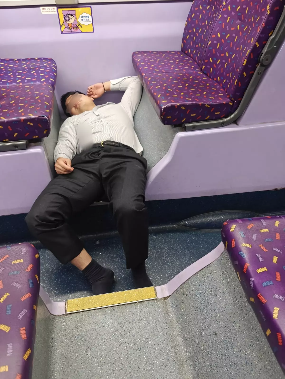 由乘客分享的幾張相片所見,一名穿着白恤衫西褲的男子,疑飲醉酒不省人事,橫躺在車廂的座位間,他一時擺出高難高睡姿,身體橫跨兩個座位,屁股凌空,一時就蜷曲在座位底,或躺睡在車廂走廊間,就連手機也跌落在地上。