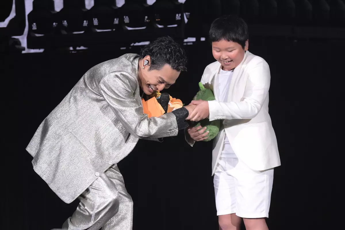 8歲AJ十分淡定,與爸爸合唱後向觀眾打招呼,又獲同學仔送花支持,杜德偉透露AJ的同學、老師今晚全部都有入場,成功將觀眾平均年齡拉低。「多謝你哋為咗睇AJ唱幾句歌,要睇兩個半鐘頭嘅演唱會。」杜德偉對AJ表示今晚是他人生首個紅館演唱會,但接下來又要暫別樂壇,叮囑他要好好讀書及返屋企做功課,但AJ即表示「做晒啦」,聽到獲准「返後台食嘢」時,AJ即大叫「Yes」十分可愛。