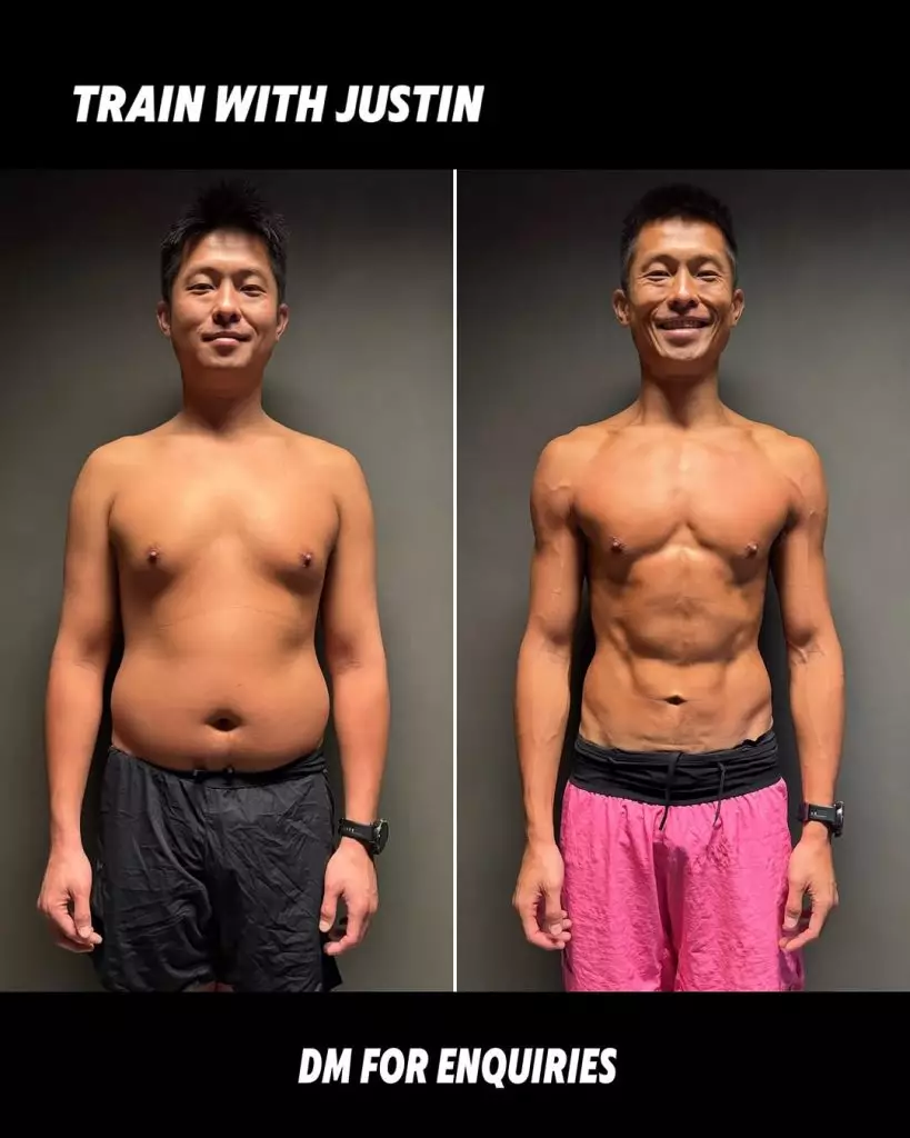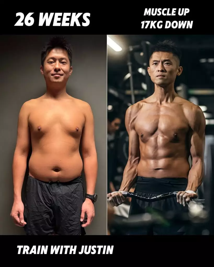 他續說:「1. 熱量赤字 食物營養管理(適當份量,每日攝取大約1800卡路里) 氣炸鍋番薯(紅春香 & 鰻魚番薯)+南瓜+薯仔+雞扒+三文魚扒+廣島蠔、Subway潛艇堡、蒸魚飯+北菇雞飯、潮州打冷鹽水雞+烏頭、麥當勞板燒雞腿包+沙律(套餐轉粟米)、白切雞、豉油雞、手撕雞、泰式燒雞+燒牛肉、白灼蝦、譚仔gymgym餐、Chicken Factory燒雞、牛筋腩米粉、無盡菜+菇、壽司、煙三文魚、蒸粟米、金奇異果、黑咖啡、無糖可樂、梳打水、遠離酒精 2. 力量訓練 每周三次一小時力量訓練 每天步行至少10000步 每星期三次40分鐘帶氧運動(非教練要求) 3. 持之以恆 在這半年的增肌減脂旅程,經過Justie教練的耐心指導,讓我一步一步了解營養及運動科學,看到自己體脂率越來越低,運動能力成正比逐步提高(頸緊背痛、膝頭痛楚、下腰疲勞減少、跑步能力提高、肥仔波變胸肌、呼吸更加暢順、睡眠質素提高、鼻鼾聲音量收細),這是最令我能夠堅持的最大原因。 當然,人總會有迷失的時候,每當我懷疑自己,Justin教練都會鼓勵我,提醒我只要方向正確,一次半次犯錯絕對不是問題。 現在半年時間已過,我也終於成功達成目標,得到一個更好的身體。 這不單只是一次減肥旅程,更是讓我得到了,終身受用的食物營養、運動科學知識。 最後想講,多謝Justin教練、多謝自己。」