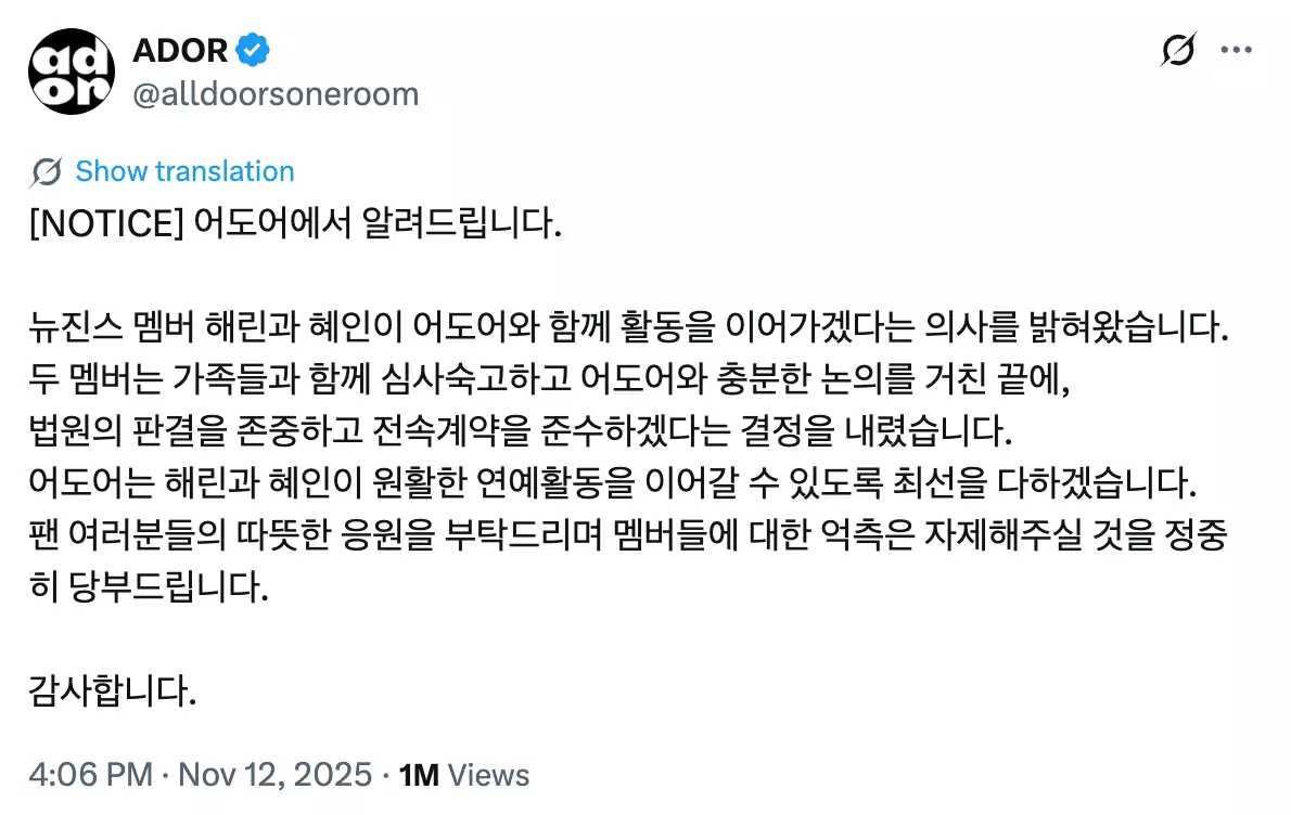 ADOR在11月12日發表聲明宣布繼續與Haerin與Hyein合作。ADOR官方X截圖